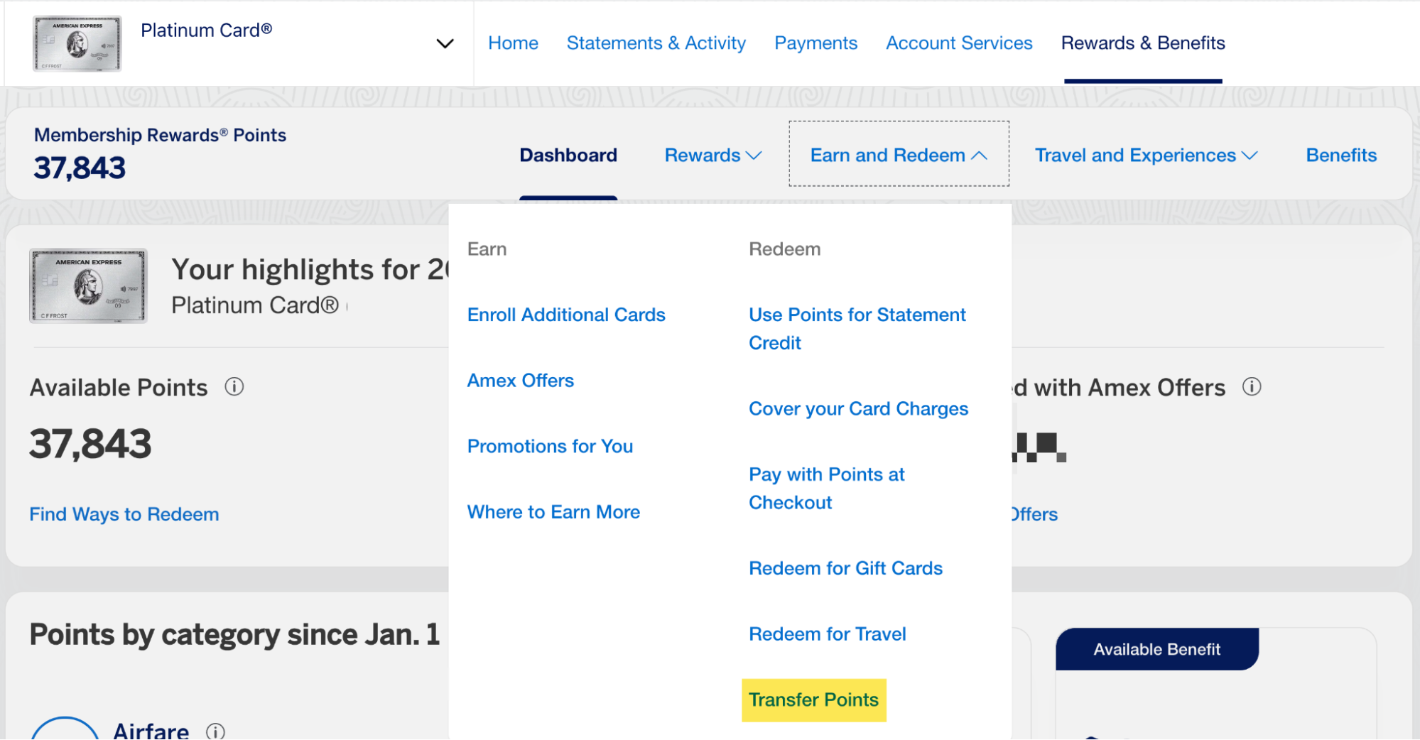 You’ll then be taken to a dashboard that displays your current rewards balance along with a litany of redemption options. Within the “Earn and Redeem” drop-down menu, you’ll find a “Transfer Points” button. Click it to be taken to a page with all American Express transfer partners.