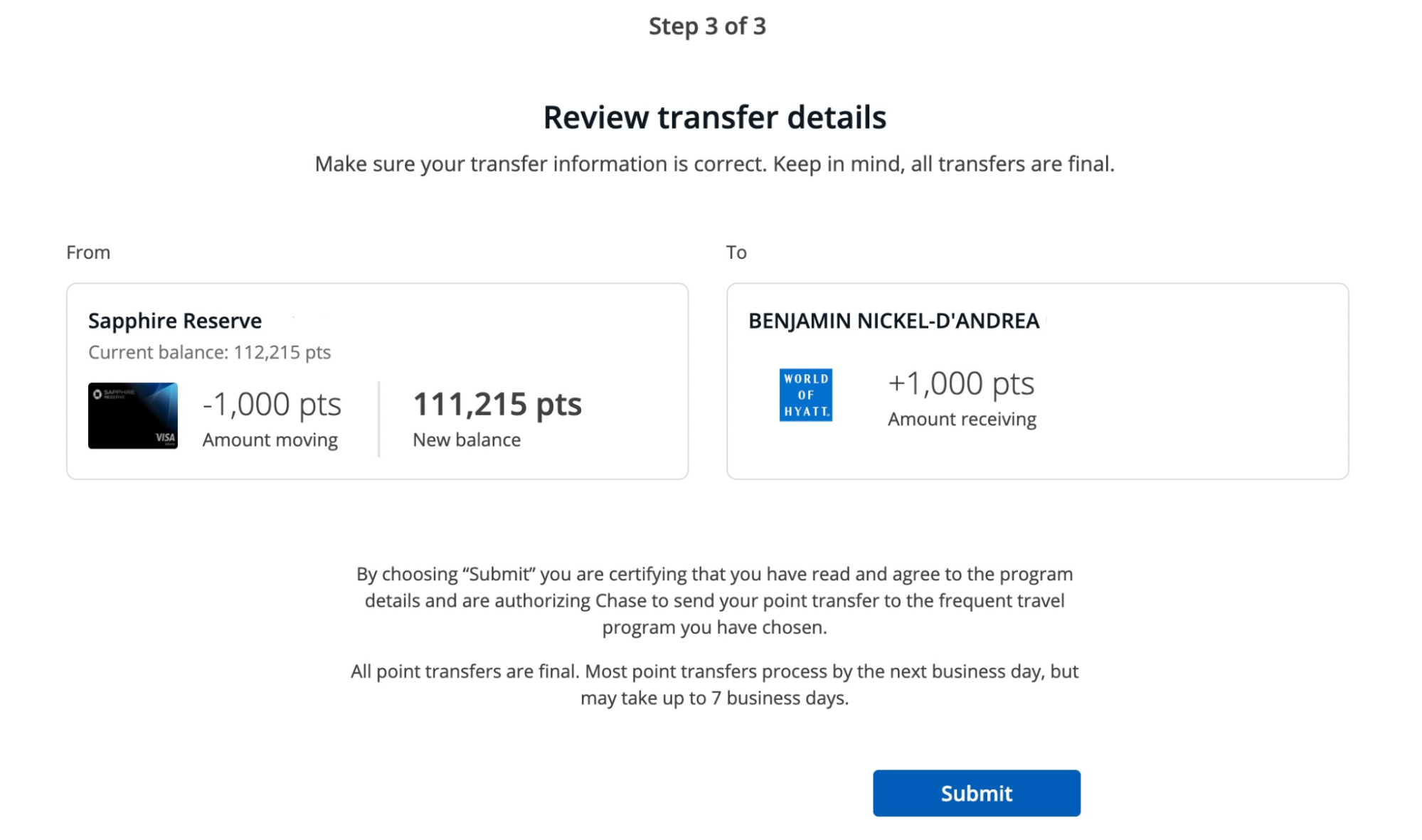 Be sure the name on your Chase account exactly matches the name on the loyalty program account you’re transferring to. Otherwise, your transfer may not go through.