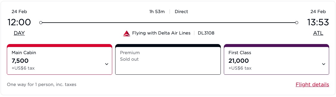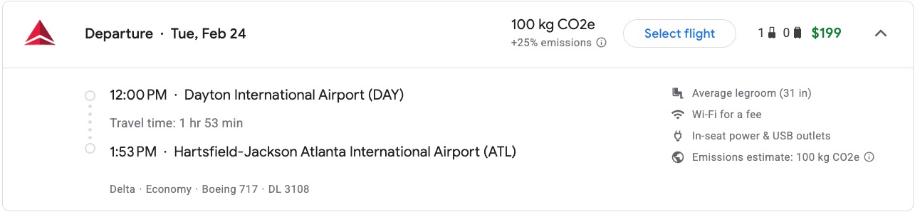 You’ll typically get the highest value for your Chase points by transferring them to these travel partners to book award flights and hotel stays. For example, the flight below from Dayton (DAY) to Atlanta (ATL) costs $199 one way.