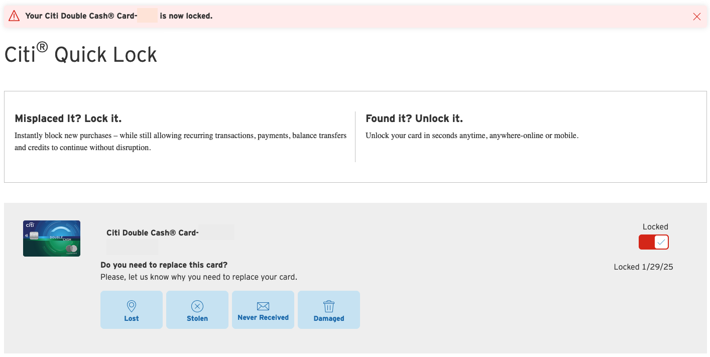 For example, if you’ve misplaced your Citi credit card, you can access a Quick Lock feature in the credit card services section of your online account. This lets you lock or unlock your card instantly with a toggle button.